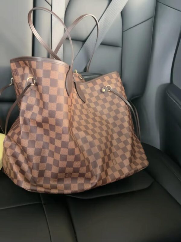 The Neverfull GM tote unites timeless design with heritage details. Crafted from elegant Damier Ebene canvas with natural cowhide trim, it is ultra-roomy but never bulky, with side laces that cinch for a sleek allure or loosen for a more casual look. Slim, comfortable handles slip easily over the shoulder or arm. Lined in colorful textile, it features a removable pouch which can serve as a clutch or an extra pocket.