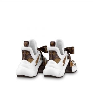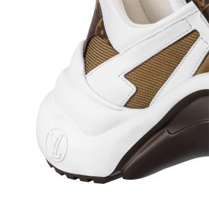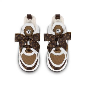 The iconic LV Archlight Trainers are revisited with rich signature details, including patent Monogram canvas and Monogram ribbon laces. The uppers combine white calf leather with technical mesh, while the bouncy, wave-shaped outsoles are highlighted in brown. Other key features of this design are its oversized tongue and feminine low cut around the ankle.