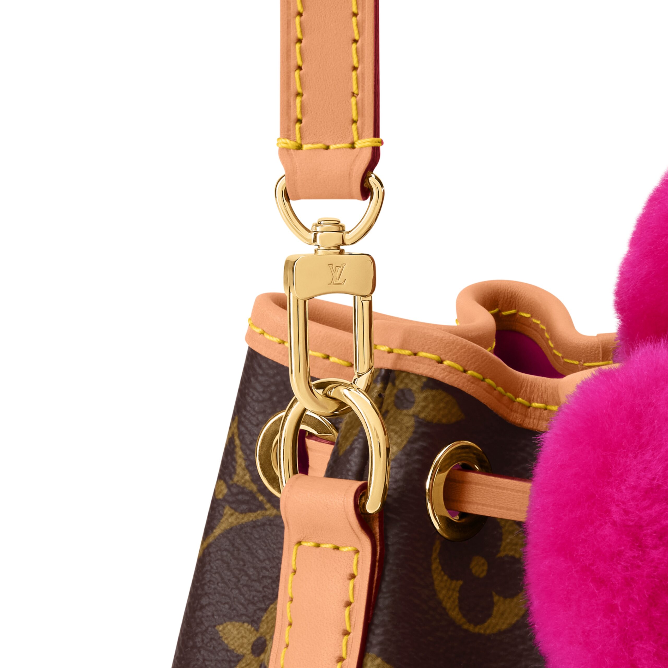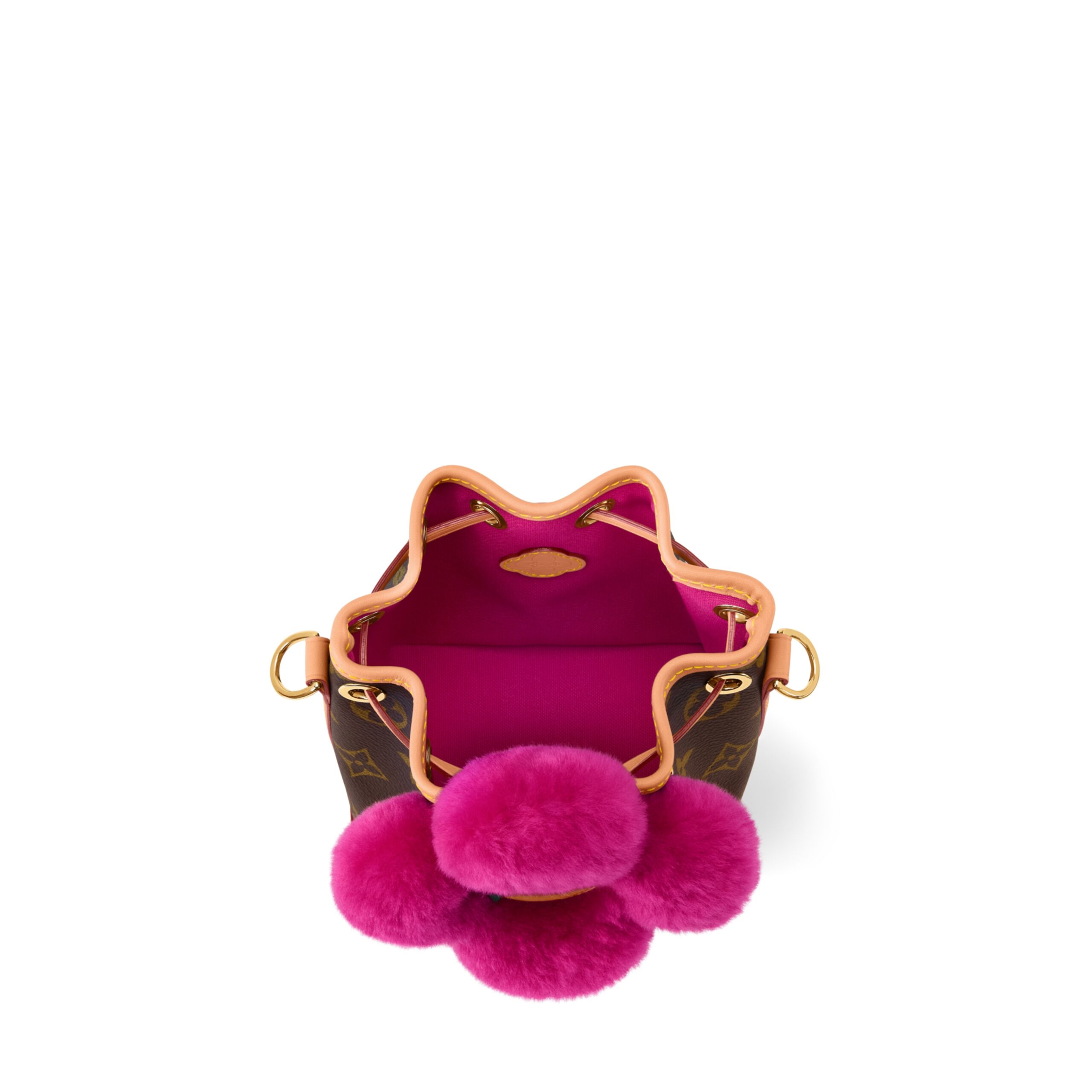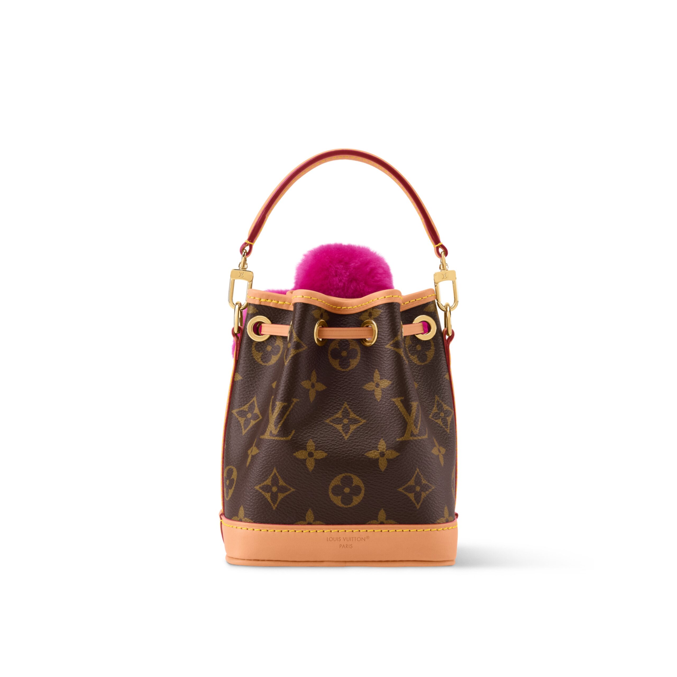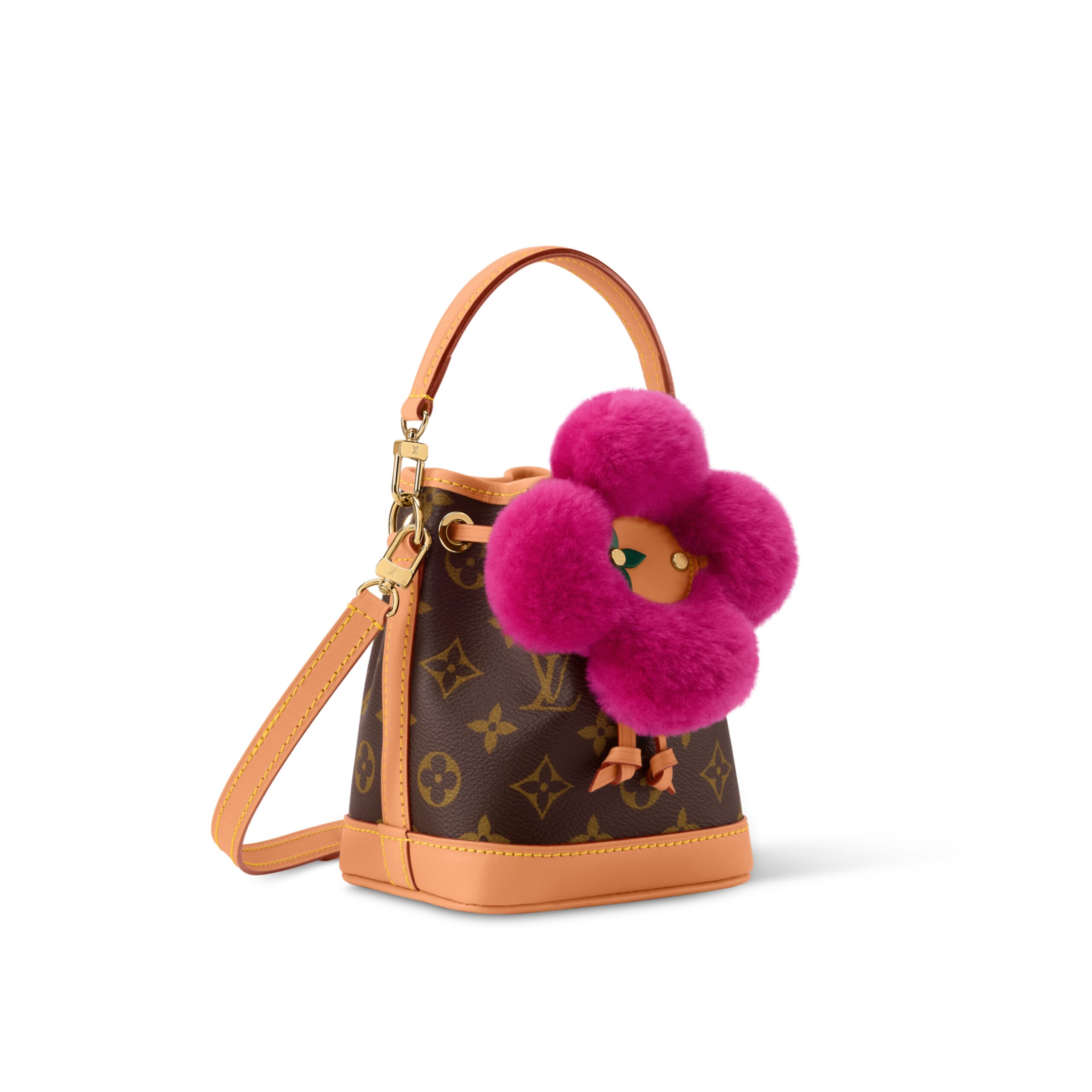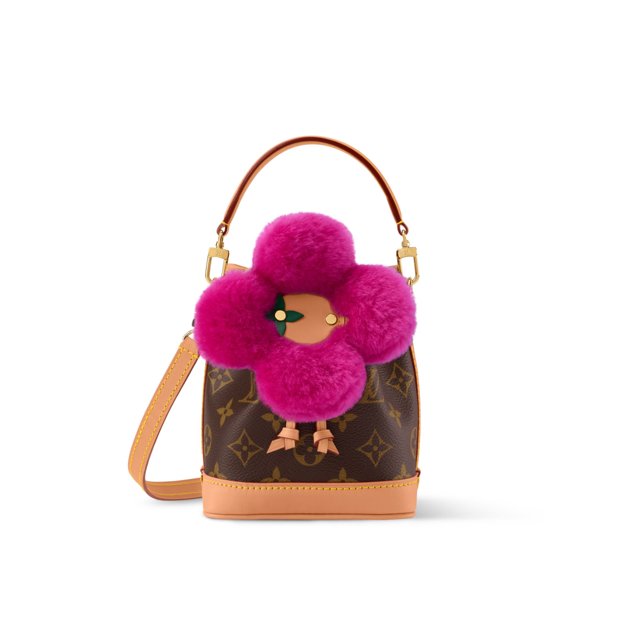 The Vivienne Winter Holiday collection lives up to its title with this Noé-Where design. It is crafted from signature Monogram canvas, trimmed with smooth cowhide and features a vibrant Frozen Orchid detail in shearling that represents the House’s mascot, Vivienne. The compact style fits everyday essentials and can be worn with or without the strap.