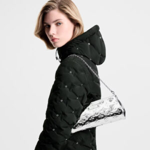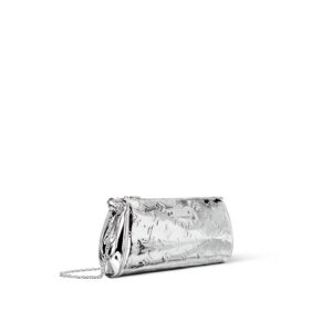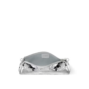Crafted in silver Monogram Miroir canvas, this Pochette Eva is a statement choice for day or night. Reimagined for the LV Ski collection, it is designed with a removable chain offering multiple carry options, and fits essential items such as a small wallet and phone. Louis Vuitton is engraved on the small plaque across the front.