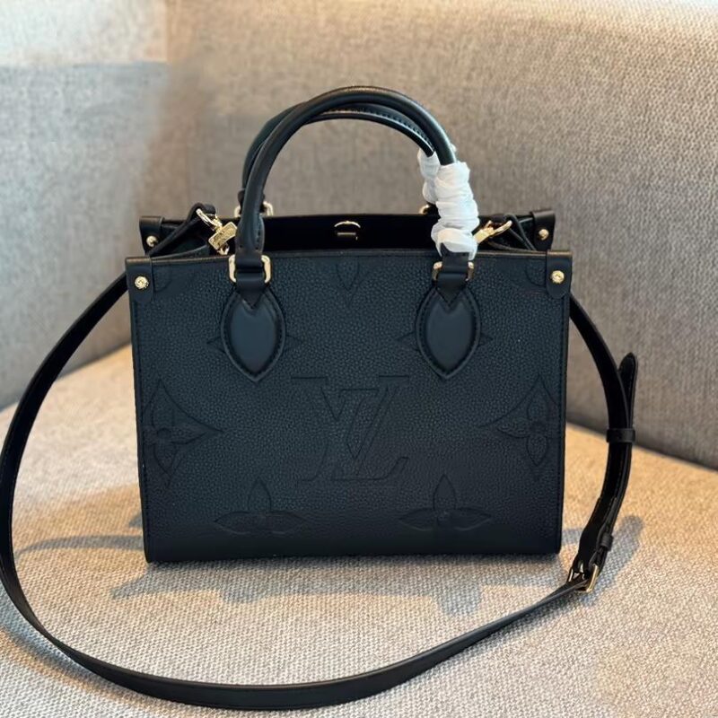 Inspired by Louis Vuitton’s famous Sac Plat from 1968, the Onthego PM tote is fashioned in Monogram Empreinte leather, embossed with a subtle embossed Giant Monogram pattern. This smaller version of the original Onthego fits essentials such as an iPad Mini. Articulated top handles and an adjustable removable strap offer a variety of carry options.