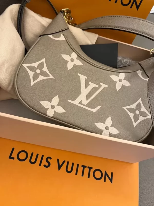 The Bagatelle mini hobo handbag is fashioned from supple, grained Monogram Empreinte leather. The embossed motif is oversized, the better to highlight the delicate color contrast of dove gray and cream. A graceful companion for any ensemble, it offers a host of stylish carry options thanks to the removable handle and detachable, adjustable strap.