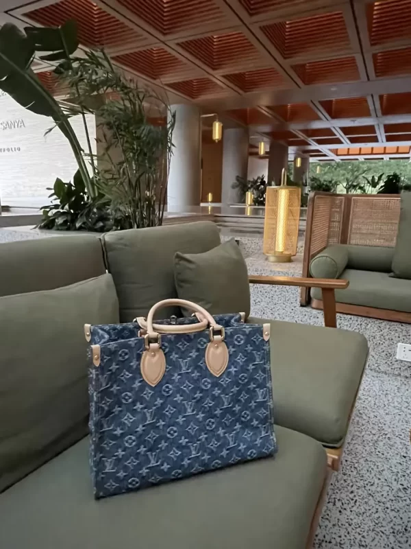 The OnTheGo MM tote bag is offered in new Monogram Denim canvas with natural cowhide-leather on the top handles and handle mounts. Thanks to the square shape, the OnTheGo has a large capacity and can hold a laptop. Its rolled-leather top handles and two longer shoulder straps enable carry options.