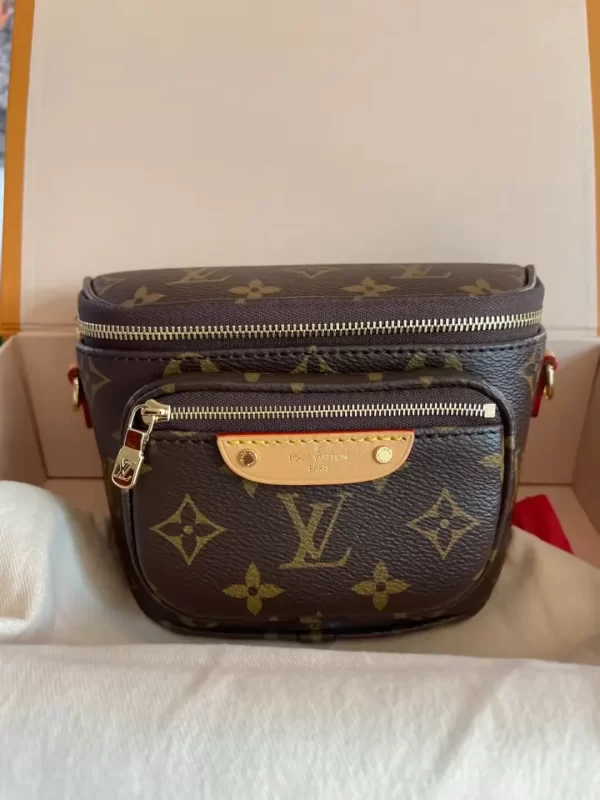 The Mini Bumbag in Monogram canvas is Louis Vuitton’s feminine interpretation of the on-trend bumbag format. Designed for versatility, it features a removable, adjustable strap in the House’s emblematic natural leather, as well as a removable gold-tone chain, which can be functional or decorative. The bag has a zipped main compartment and a zipped front pocket with an embossed leather tag.