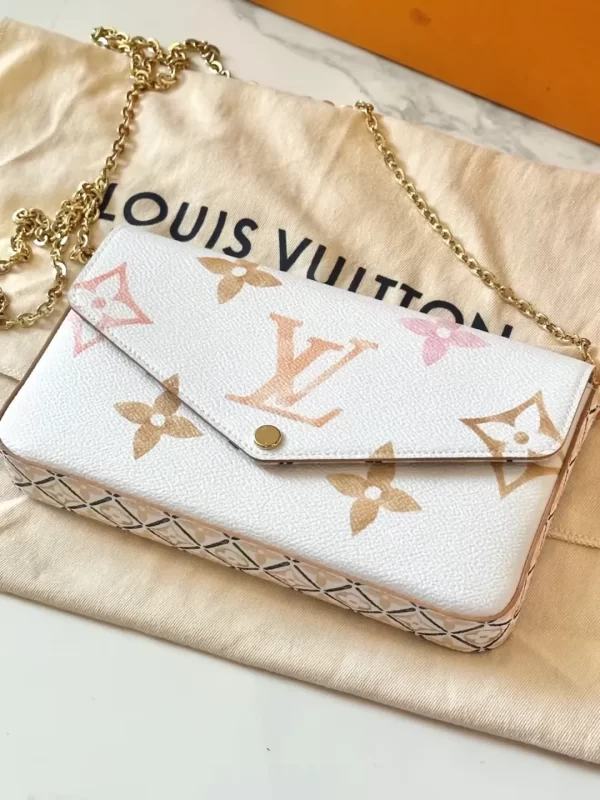 This edition of the Félicie Pochette is part of the seasonal Resort collection. It comes in coated canvas printed with an oversized Monogram pattern in a palette of summery hues. This versatile pouch has two removable pockets and a removable, gold-tone chain, enabling it to be carried as a clutch as well as a shoulder bag.