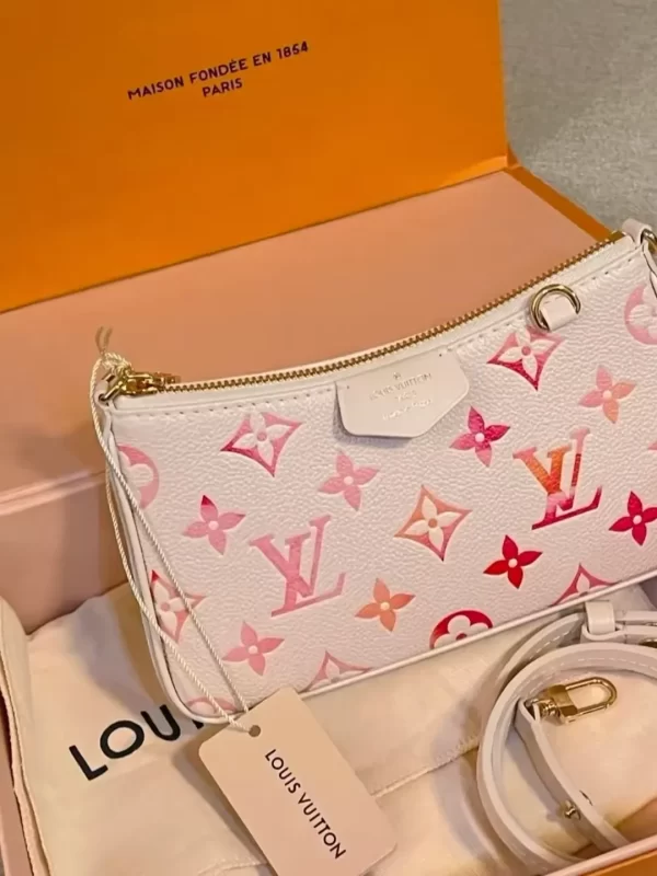 This edition of the Easy Pouch on Strap belongs to the Sunrise Aquarelle collection. It is crafted from Monogram Empreinte leather, which is digitally printed with a gradation of oranges and pinks evoking a watercolor painting. Large enough for everyday essentials, this bag has a removable chain and a removable, adjustable strap for shoulder or cross-body carry.