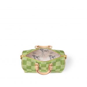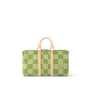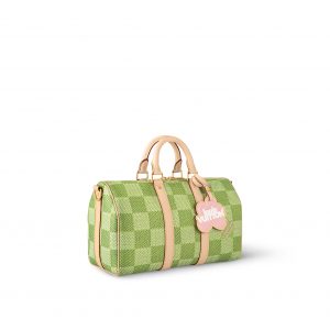 Part of the collaboration with Tyler, this Keepall Bandoulière 35 is fashioned from Damier Golf coated canvas and trimmed with pale cowhide leather. The green colorway is perfectly complemented by the pink Louis Vuitton flower charm and the “L.Vuitton Marque Déposée,” also in pink, in the one of the Damier squares.