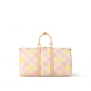 This Keepall 45 Bandoulière bag is made from Damierlicious coated canvas, with its mesmerizing Giant Damier motif combining four different pastel shades. This cabin-sized bag features cowhide-leather top handles, lateral reinforcement bands, and removable name tag. A removable and adjustable leather strap enables shoulder carry.